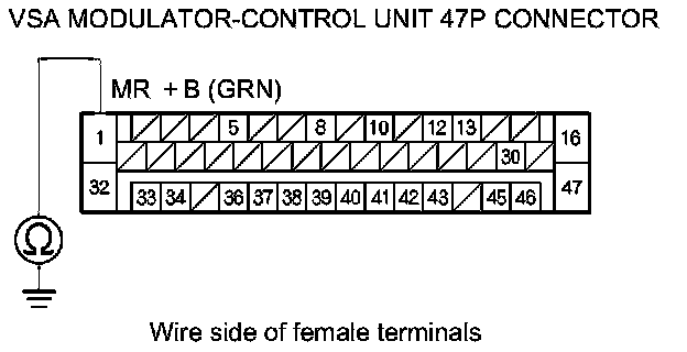 9. Check for continuity between VSA modulator-control unit 47P connector terminal No. 1 and body ground.