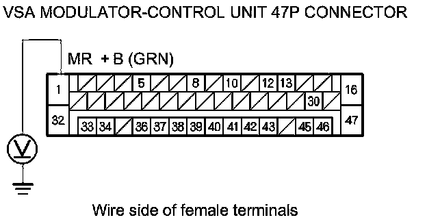 17. Measure the voltage between VSA modulator-control unit 47P connector terminal No. 1 and body ground.