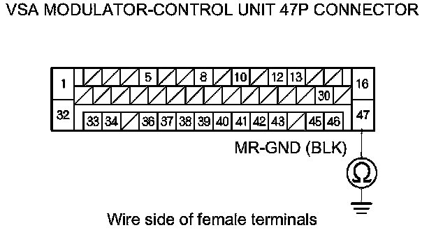 18. Check for continuity between VSA modulator-control unit 47P connector terminal No. 47 and body ground.