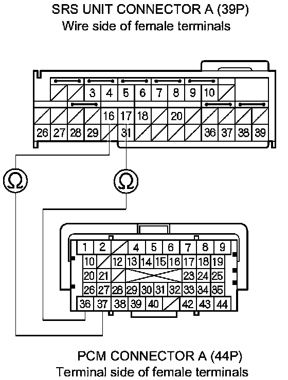 11. Check for continuity between SRS unit connector A (39P) terminal No. 16 and PCM connector A (44P) terminal No. 37, and between SRS unit connector A (39P) terminal No. 17 and PCM connector A (44P) terminal No. 36.