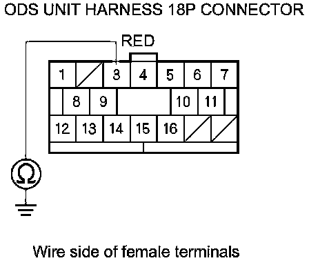 11. Measure the resistance between body ground and ODS unit harness 18P connector terminal No. 3. There should be an open circuit or at least 1 MOhms.