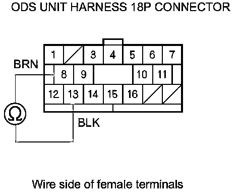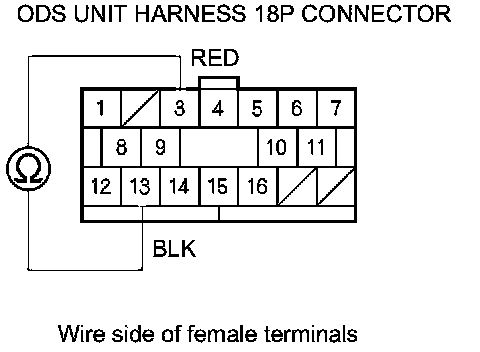 12. Measure the resistance between ODS unit harness 18P connector terminals No. 3 and No. 13. There should be an open circuit or at least 1 MOhms.