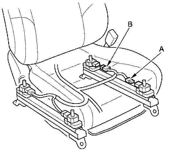 18. Disconnect the ODS unit harness 3P connector (A) from the front passenger's weight sensor (front inner side), then disconnect the ODS unit harness 3P connector (B) from the front passenger's weight sensor (rear inner side).