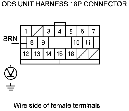 21. Measure the voltage between body ground and ODS unit harness 18P connector terminal No. 8. There should be less than 0.2 V.