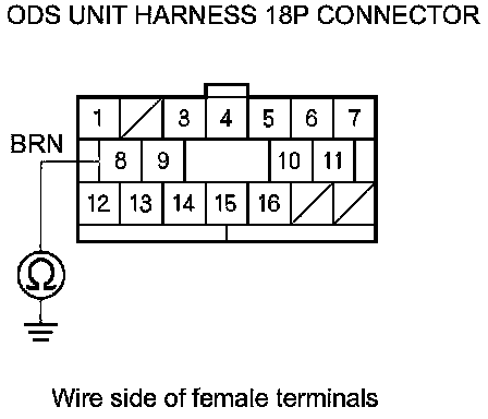 28. Measure the resistance between body ground and ODS unit harness 18P connector terminal No. 8. There should be an open circuit or at least 1 MOhms.