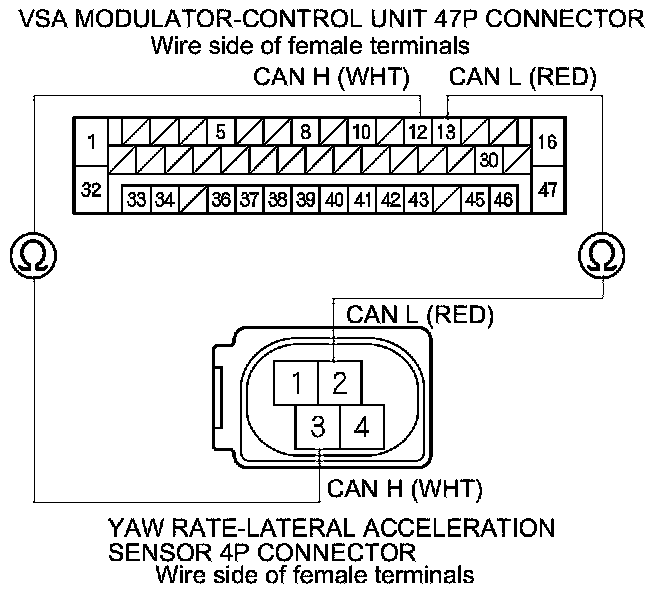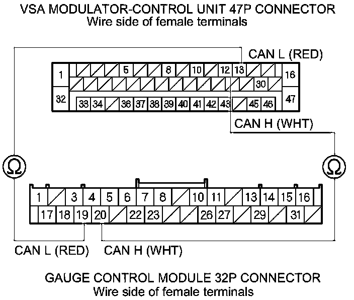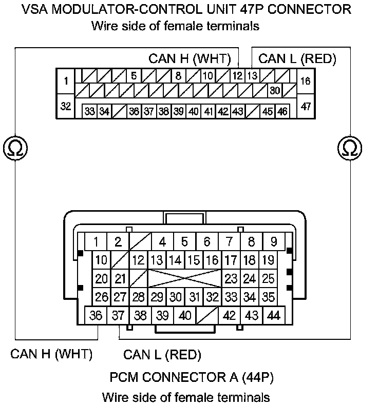 Check for loose terminals in the VSA modulator-control unit 47P connector. If the VSA modulator-control unit was updated, substitute a known-good VSA modulator-control unit Service and Repair, then retest. If the VSA modulator-control unit was substituted, go to step 1.