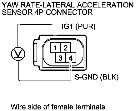 16. Measure the voltage between yaw rate-lateral acceleration sensor 4P connector terminals No. 1 and No. 4.