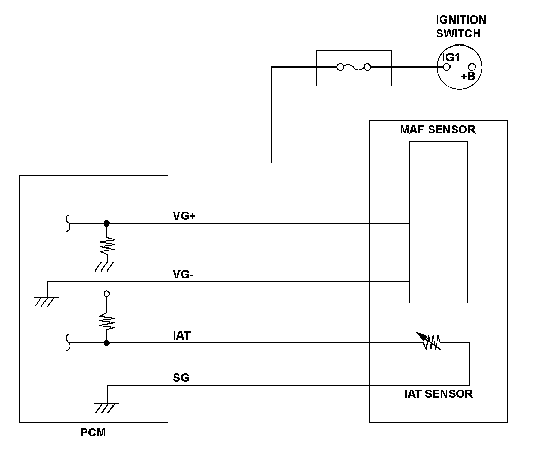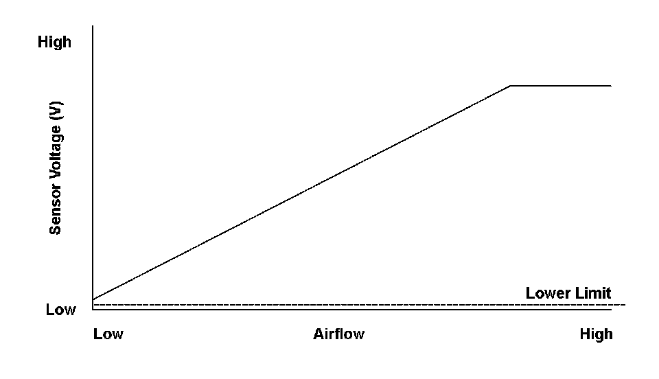 The mass airflow (MAF) sensor is attached to the intake air passage, and it measures the amount of intake airflow. The MAF sensor is a hot wire airflow meter. The airflow cools the electrically heated wire that is mounted in the air passage. The powertrain control module (PCM) determines the amount of intake airflow by detecting the current that is required to keep the hot wire at a constant temperature. The lower limit of the MAF sensor output is specified. If the output is below that limit, the PCM detects a malfunction and stores a DTC.
