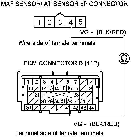7. Check for continuity between PCM connector terminal B32 and MAF sensor/IAT sensor 5P connector terminal No. 4.