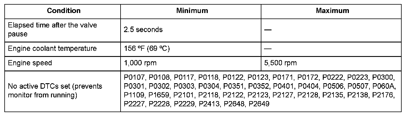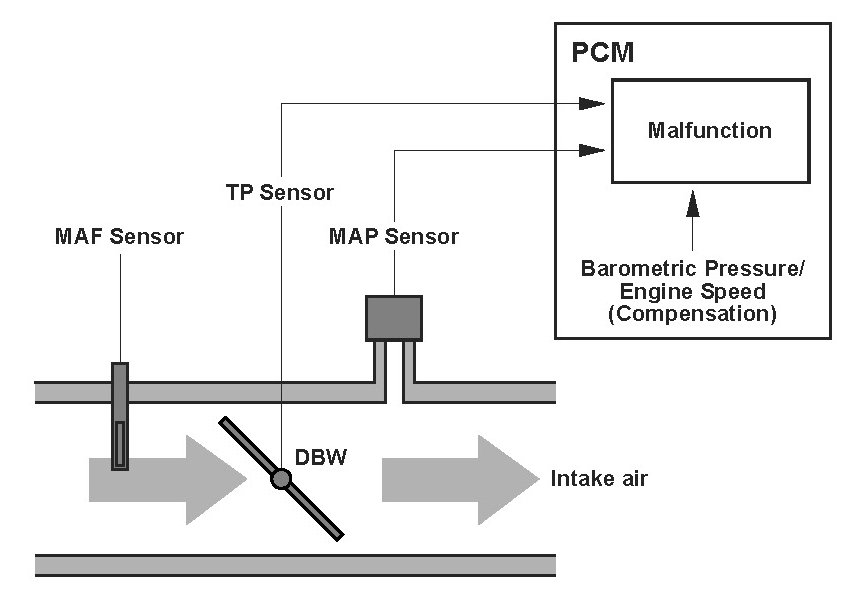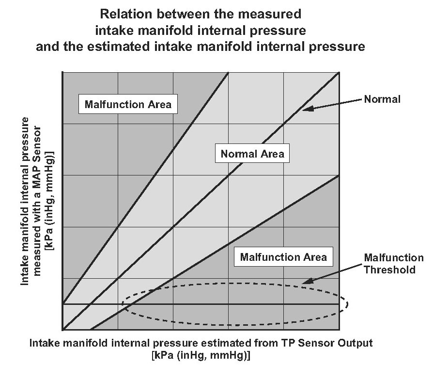 The amount of intake air is adjusted by the opening angle of the throttle valve, and the pressure inside the intake manifold is measured with the manifold absolute pressure (MAP) sensor. When the throttle valve is opened fully for quick acceleration, the intake manifold pressure suddenly drops to near atmospheric pressure, and the MAP sensor output reads near atmospheric pressure. The powertrain control module (PCM) compares the intake manifold internal pressure estimated from the output value of the MAP sensor (intake manifold inside pressure), the throttle position (TP) sensor, the barometric pressure (BARO) sensor output, and the engine rpm. When the deviation is large (when it is in a malfunction area), the PCM detects a malfunction and stores a DTC.