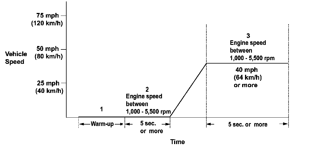 3. Drive the vehicle at a steady speed of 40 mph (64 km/h) or more and engine speed between 1,000 - 5,500 rpm for at least 5 seconds.