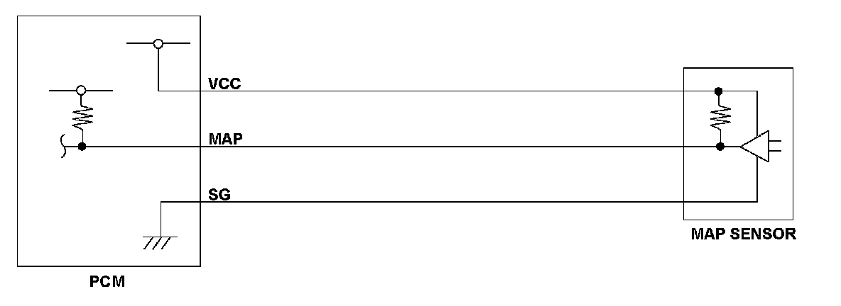 The manifold absolute pressure (MAP) sensor senses manifold absolute pressure (vacuum) and converts it into electrical signals. The MAP sensor outputs low signal voltage at high vacuum (throttle valve closed) and high signal voltage at low vacuum (throttle valve wide open). If the signal voltage from the MAP sensor is a set value, the powertrain control module PCM) detects a malfunction and stores a DTC.
