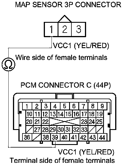 11. Check for continuity between PCM connector terminal C39 and MAP sensor 3P connector terminal No. 1.
