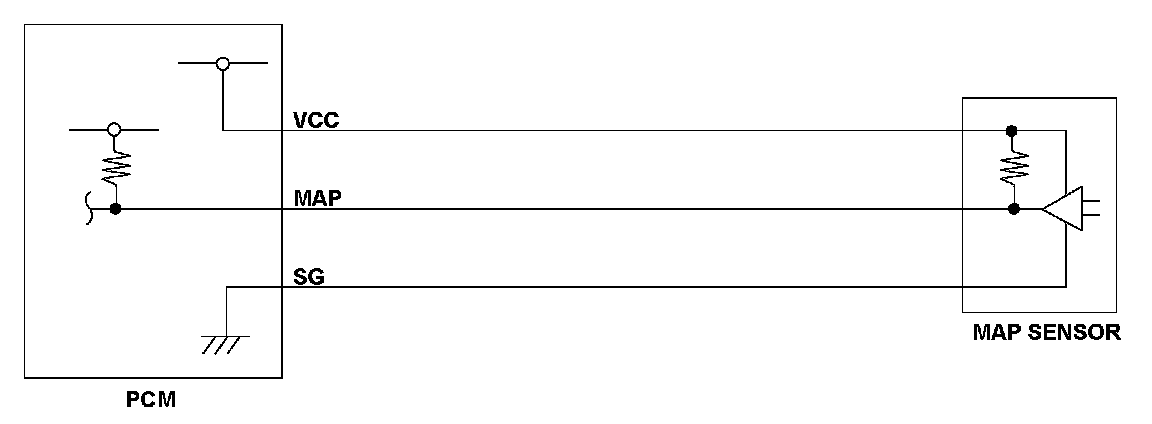 The manifold absolute pressure (MAP) sensor senses manifold absolute pressure (vacuum) and converts it into electrical signals. The MAP sensor outputs low signal voltage at high vacuum (throttle valve closed) and high signal voltage at low vacuum (throttle valve wide open). If the signal voltage from the MAP sensor is a set value, the powertrain control module (PCM) detects a malfunction and stores a DTC.