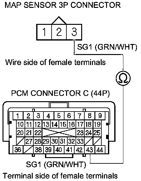 15. Check for continuity between PCM connector terminal C43 and MAP sensor 3P connector terminal No. 3.