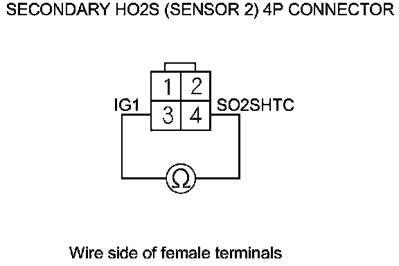 9. At the secondary HO2S (Sensor 2) side, measure the resistance between secondary HO2S (Sensor 2) 4P connector terminals No. 3 and No. 4.