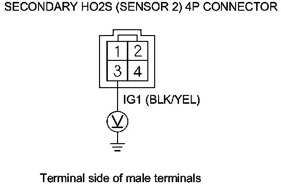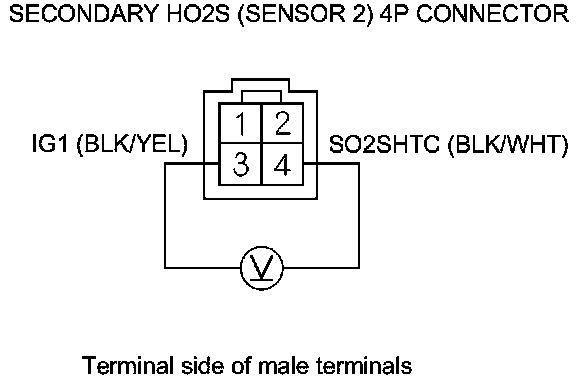 12. Measure the voltage between secondary HO2S (Sensor 2) 4P connector terminals No. 3 and No. 4.