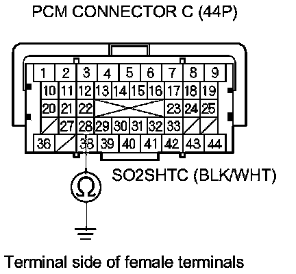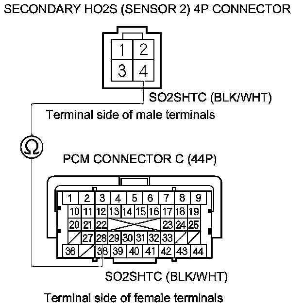 21. Check for continuity between PCM connector terminal C28 and secondary HO2S (Sensor 2) 4P connector terminal No. 4.