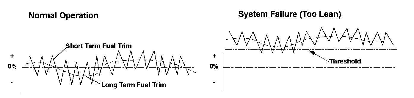 The powertrain control module (PCM) detects the oxygen content in the exhaust gas from the air/fuel ratio (A/F) sensor (sensor 1) signal voltage, and it uses fuel feedback control to maintain the optimal air/fuel ratio. The air/fuel ratio coefficient for correcting the amount of injected fuel is the short term fuel trim. The PCM varies short term fuel trim continuously to keep the air/fuel ratio close to the stoichiometric ratio for all driving conditions. Long term fuel trim is computed from short term fuel trim and is used to regulate long term deviation from the stoichiometric air/fuel ratio, which occurs when fuel metering components deteriorate with age or system failures occur. In addition, long term fuel trim is stored in the PCM memory and is used to determine when fuel metering components malfunction. When long term fuel trim is higher than normal, which is about 1.0 (0 %), the amount of injected fuel must be increased, and when lower than normal, it must be decreased. If long term fuel trim is higher than normal (too lean), a malfunction in the fuel metering components is detected and a DTC is stored.