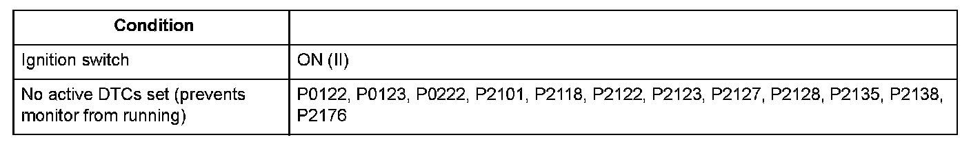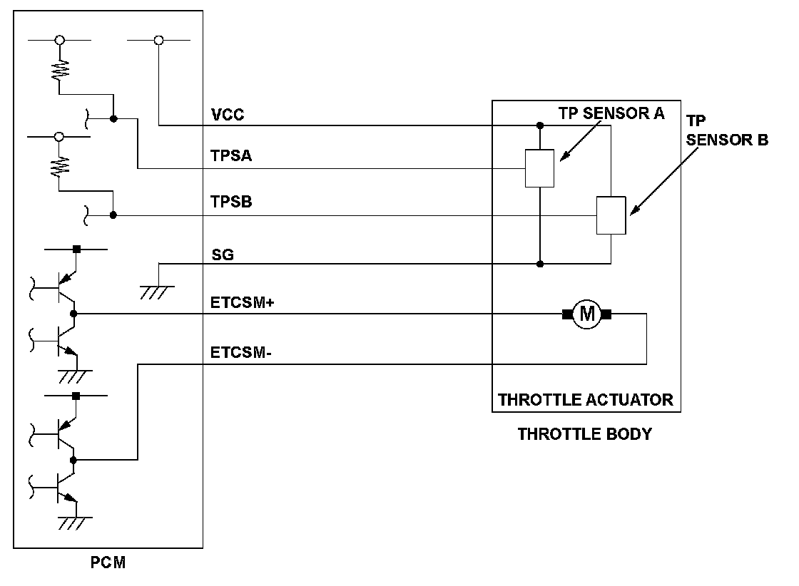 The electronic throttle control system controls the throttle valve opening. The system includes the throttle actuator, the throttle valve, throttle position (TP) sensors A and B, the electronic throttle control system (ETCS) control relay, the accelerator pedal position (APP) sensor, and the powertrain control module (PCM). TP sensor B is a semiconductor type, and it is attached to the throttle body and shaft to determine throttle valve position. The throttle valve position signal from TP sensor B is transmitted to the PCM for target position feedback control. If the signal from TP sensor B is a fixed value for a set time, the PCM detects a TP sensor B malfunction and stores a DTC.