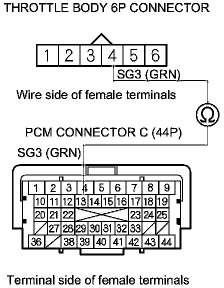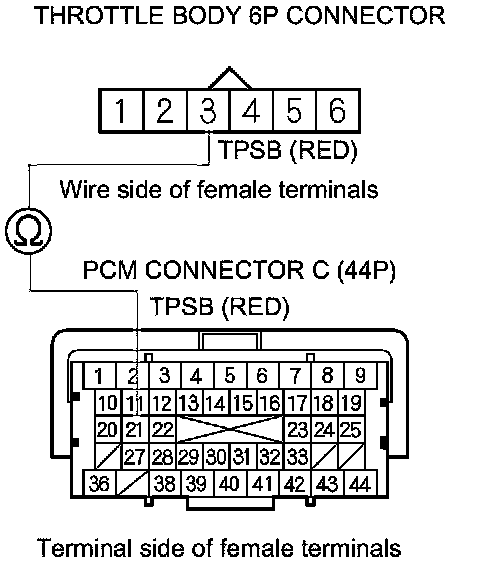 17. Check for continuity between PCM connector terminal C13 and throttle body 6P connector terminal No. 4.