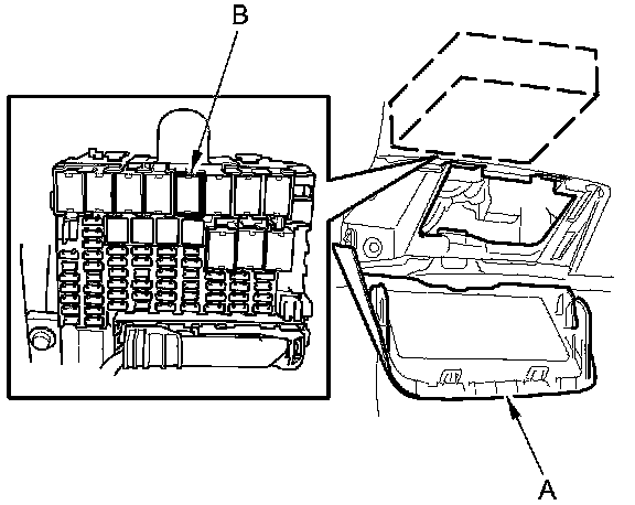 16. Open the fuse access panel (A), then test the ignition coil relay (B) in the under-dash fuse/relay box. Testing and Inspection.