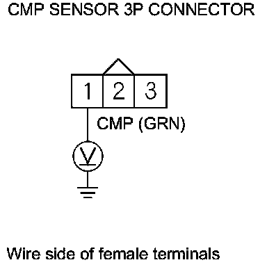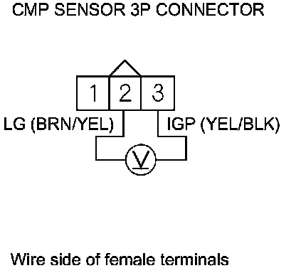10. Measure the voltage between CMP sensor 3P connector terminals No. 2 and No. 3.