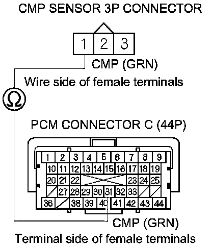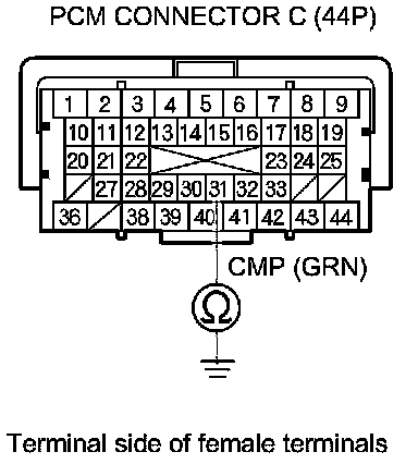 15. Check for continuity between PCM connector terminal C31 and CMP sensor 3P connector terminal No. 1.