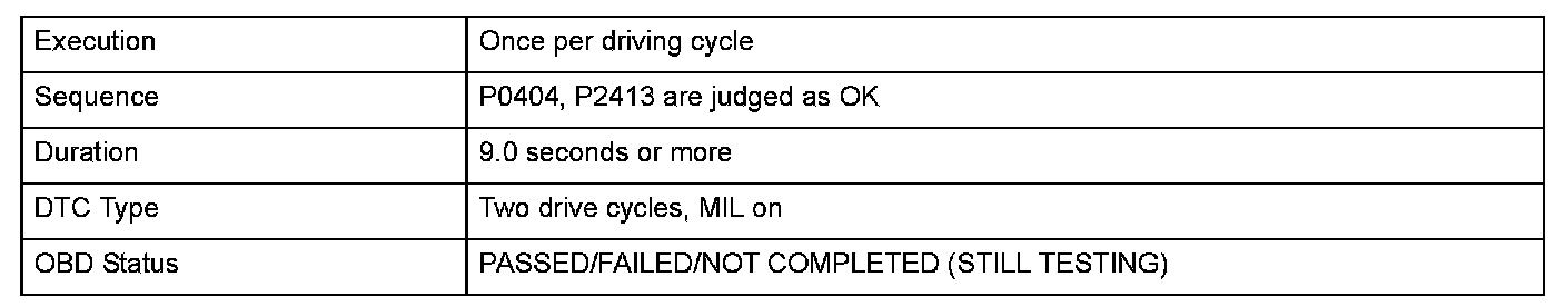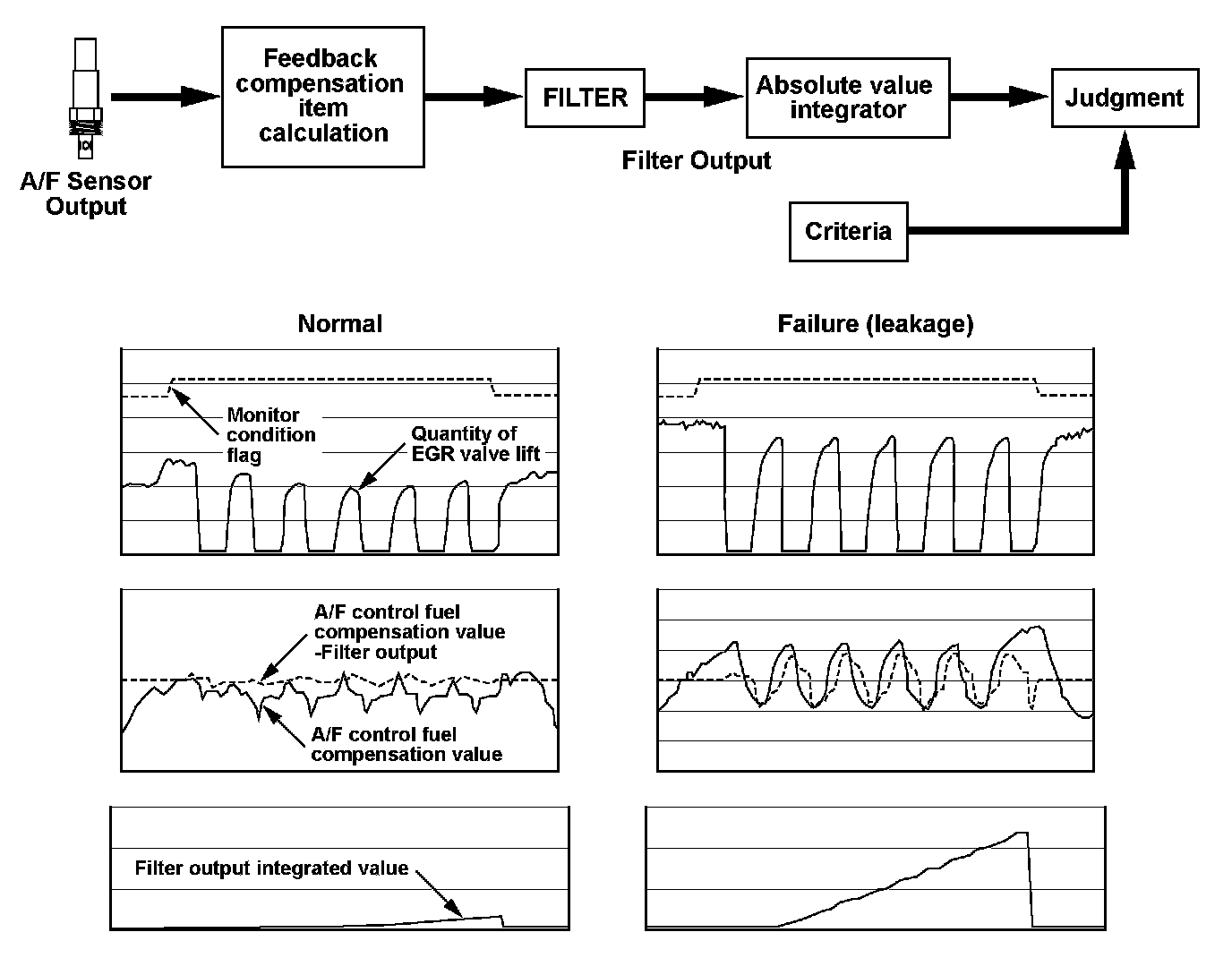 The exhaust gas recirculation (EGR) deterioration failure conditions include a sticking lift sensor, restricted passages, and leakage from the external piping. At any specific EGR lift value there is a corresponding A/F compensation value. If the A/F compensation value is greater than the corresponding EGR lift value, the powertrain control module (PCM) detects a malfunction and stores a DTC.