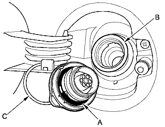 2. Check the fuel fill cap seal (A) and the fuel fill pipe mating surface (B). Make sure the fuel fill cap tether cord (C) is not caught under the cap.