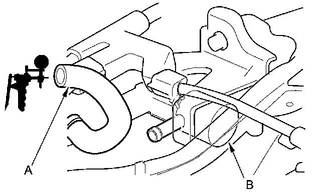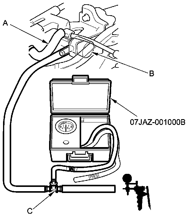7. Disconnect the vacuum hose (purge line) (A) from the EVAP canister purge valve (B) in the engine compartment, then connect a T-fitting (C), a vacuum gauge, and a vacuum pump/gauge, 0-30 inHg, to the EVAP canister purge valve as shown.