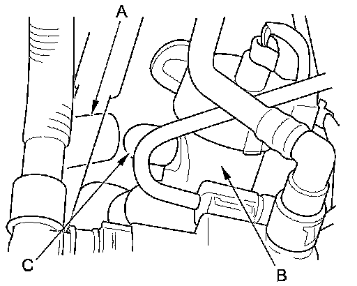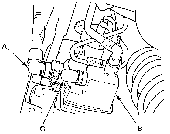 12. Disconnect the fuel tank vapor recirculation tube (A) from the EVAP canister (B), and plug the EVAP canister port (C).