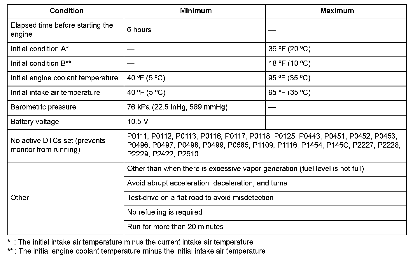 1. After the vehicle has been left for an appropriate amount of time as specified, with the engine coolant temperature and intake air temperature within the specified range, start the engine.