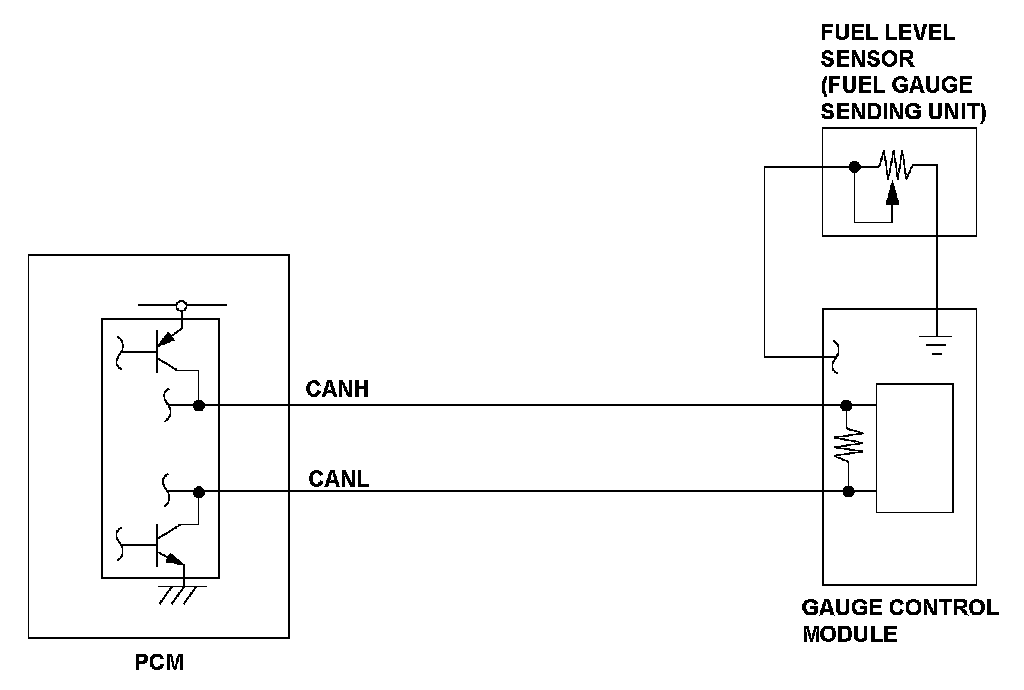 The fuel level sensor (fuel gauge sending unit) is incorporated into the fuel pump and installed in the fuel tank. Using a built-in potentiometer and float, it converts the movement of the float to electrical signals as an output that corresponds to fuel level variations in the fuel tank. The fuel level, which is indicated by the gauge control module, is sent to the powertrain control module (PCM) via the controller area network (CAN). If the PCM detects a signal from the fuel level sensor (fuel gauge sending unit) above a predetermined value for a set time, it detects a malfunction and stores a DTC.