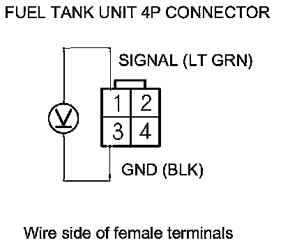 8. Measure the voltage between fuel tank unit 4P connector terminals No. 1 and No. 3.