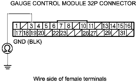 13. Check for continuity between gauge control module 32P connector terminal No. 3 and body ground.