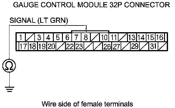 15. Check for continuity between gauge control module 32P connector terminal No. 8 and body ground.