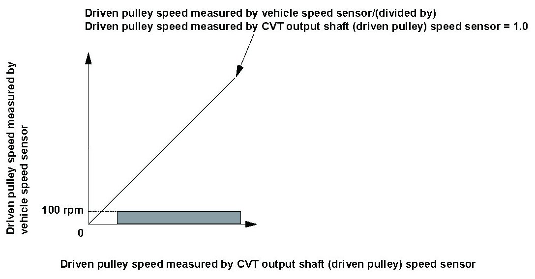 The driven pulley speed measured by the vehicle speed sensor is 100 rpm or less for at least 4 seconds when the vehicle speed measured by the CVT output shaft (driven pulley) speed sensor is 8 mph (14 km/h) or more.