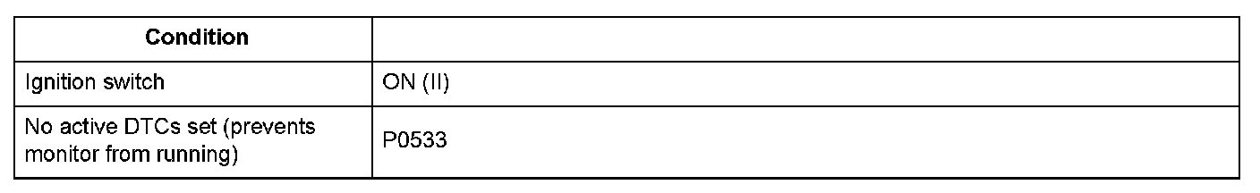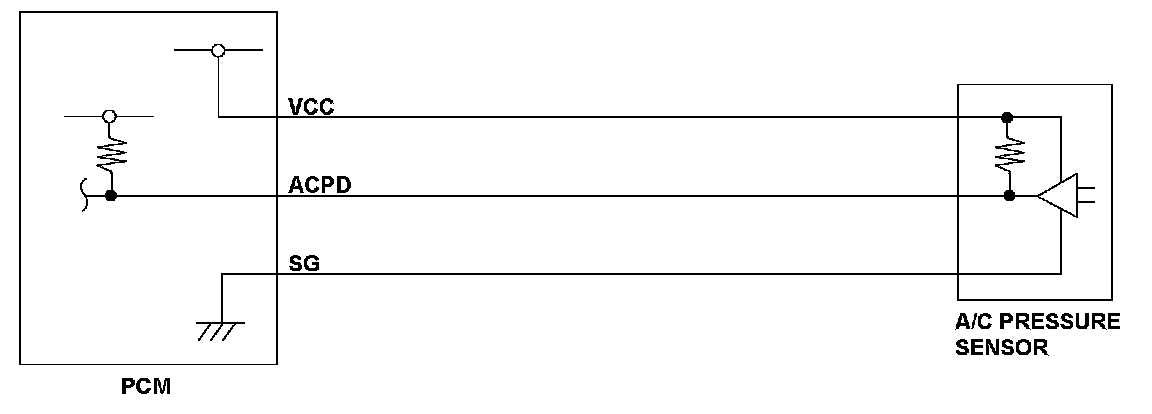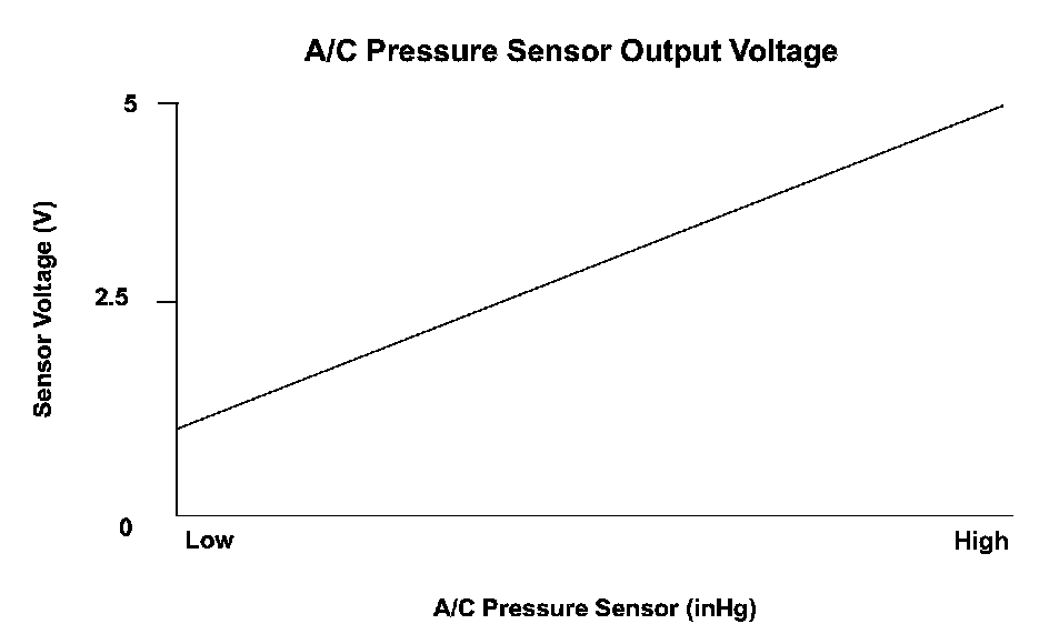 The A/C pressure sensor measures the change in the pressure of the air conditioning refrigerant. The signal from the A/C pressure sensor is low voltage at low pressure (when the air conditioning load is low) and high voltage at high pressure (when the air conditioning load is high). The powertrain control module (PCM) compares the expected voltage to the A/C pressure sensor output voltage. When the A/C pressure sensor output voltage is lower than the expected voltage for a set time, the PCM detects a malfunction and stores a DTC.