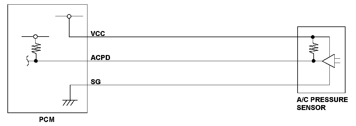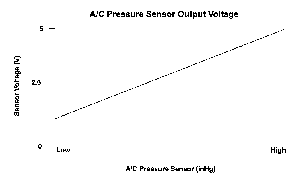 The A/C pressure sensor measures the change in the pressure of the air conditioning refrigerant. The signal from the A/C pressure sensor is low voltage at low pressure (when the air conditioning load is low) and high voltage at high pressure (when the air conditioning load is high). The powertrain control module (PCM) compares the expected voltage to the A/C pressure sensor output voltage. When the A/C pressure sensor output voltage is higher than the expected voltage for a set time, the PCM detects a malfunction and stores a DTC.