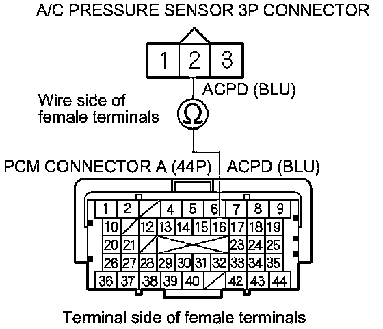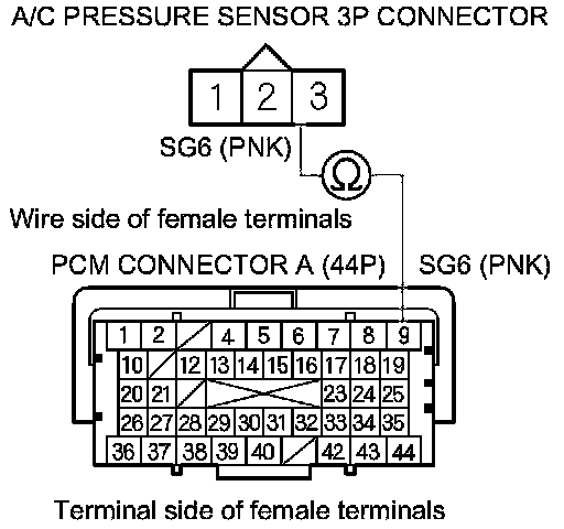 17. Check for continuity between PCM connector terminal A16 and A/C pressure sensor 3P connector terminal No. 2.