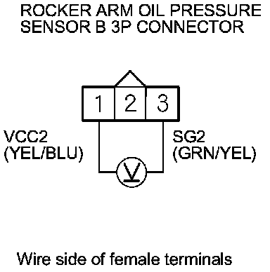 9. Measure the voltage between rocker arm oil pressure sensor B 3P connector terminals No. 1 and No. 3.