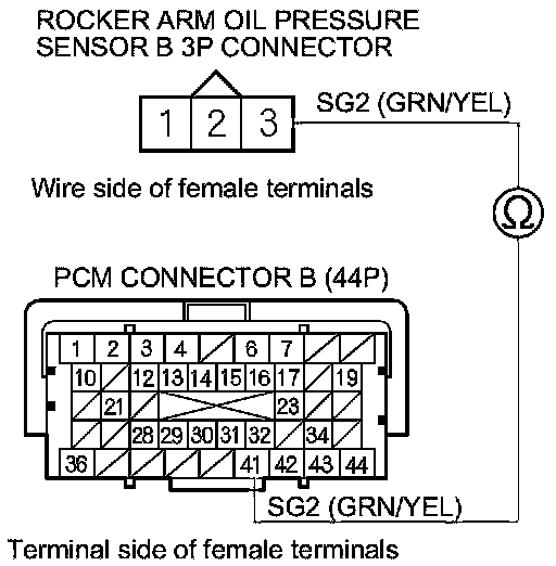 13. Check for continuity between PCM connector terminal B41 and rocker arm oil pressure sensor B 3P connector terminal No. 3.