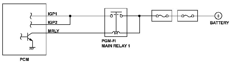 If there is a short to ground in the harness between the powertrain control module (PCM) and PGM-FI main relay 1, PGM-FI main relay 1 stays ON even if the ignition switch is turned to LOCK (0), and the PCM remains active. However, the engine is not running because power for the gauges, the ignition, and the fuel pump is turned OFF by the ignition switch. When the PCM operates for a set time after the ignition switch is turned to LOCK (0), it detects a malfunction and stores a DTC.