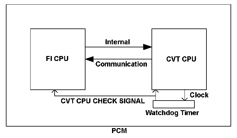 When a malfunction occurs in the internal communication between the FI CPU and the CVT CPU in the powertrain control module (PCM) and the internal communication is interrupted for a set time, or when the watchdog timer that monitors the CVT CPU detects an abnormality in the CVT CPU and notifies the FI CPU via the CVT CPU check signal line, the PCM detects a malfunction and stores a DTC.