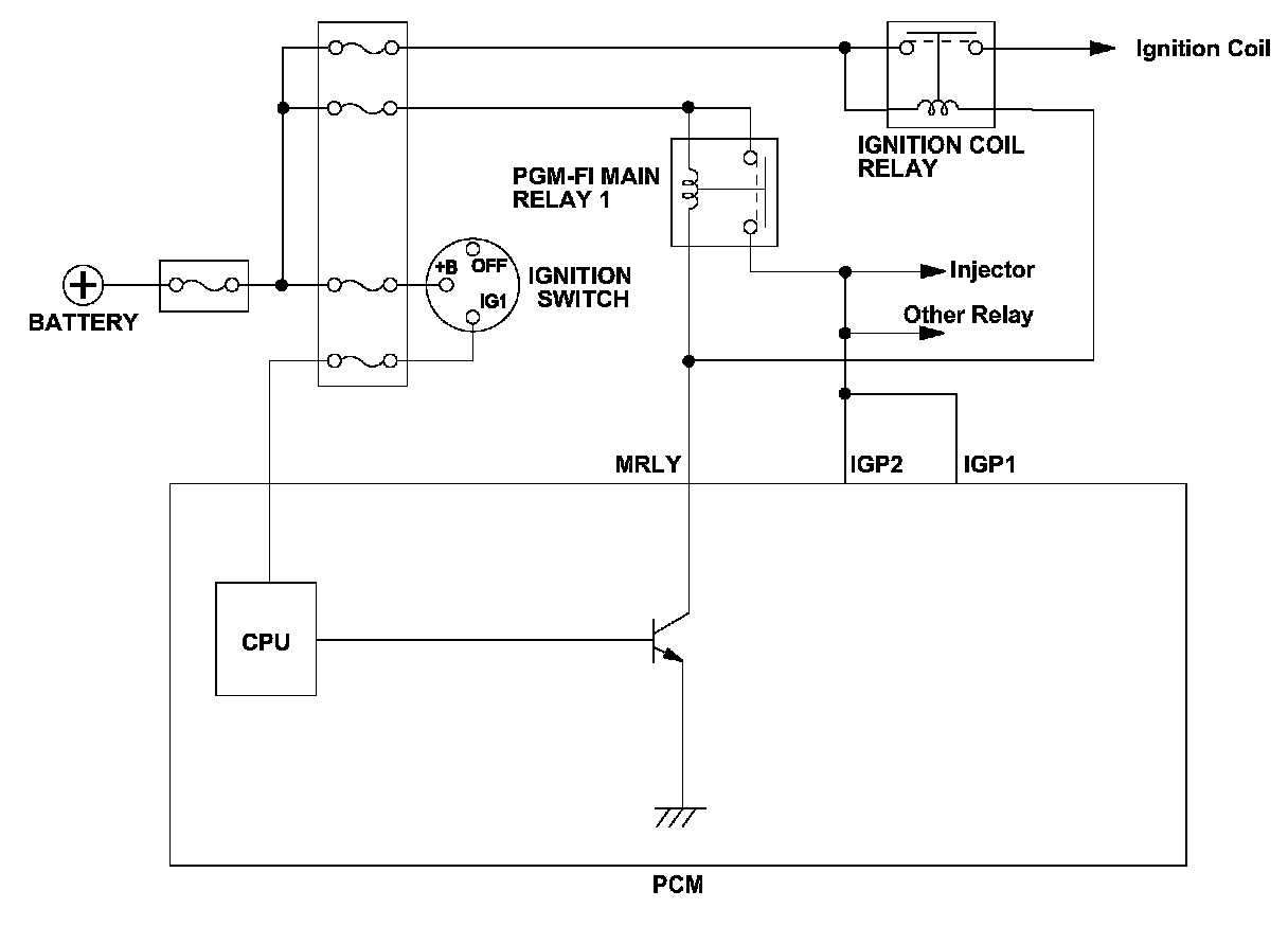 After the ignition switch is turned to LOCK (0), the powertrain control module (PCM) does not shut down immediately. After finishing a predetermined process according to the request of each device and system, the power supply is automatically disconnected (self shut-down function). The PCM power is disconnected by controlling PGM-FI main relay 1. During a normal PCM shut down, the shut down process is executed by the CPU, PGM-FI main relay 1 is turned off, and the voltage to the PCM is turned off to shut down the PCM. When the voltage to the PCM is turned off and the PCM shuts down without the normal shut down procedure, the PCM detects a malfunction in the PGM-FI main relay 1 control circuit and stores a DTC.