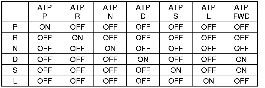 3. Compare the ATPP, ATPR, ATPN, ATPD, ATPS, ATPL, and ATPFWD inputs with the HDS to the following table in each shift lever position.