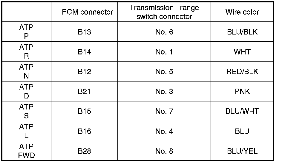 13. Check for continuity between the transmission range switch connector terminal and the PCM connector terminal of the input which indicated ON; refer to the following table.