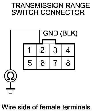 7. Connect the transmission range switch connector terminal which did not indicate ON in step 4 to body ground with a jumper wire; refer to the following table.