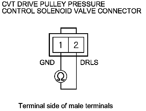 10. Measure the resistance between CVT drive pulley pressure control solenoid valve connector terminals No. 1 and No. 2.